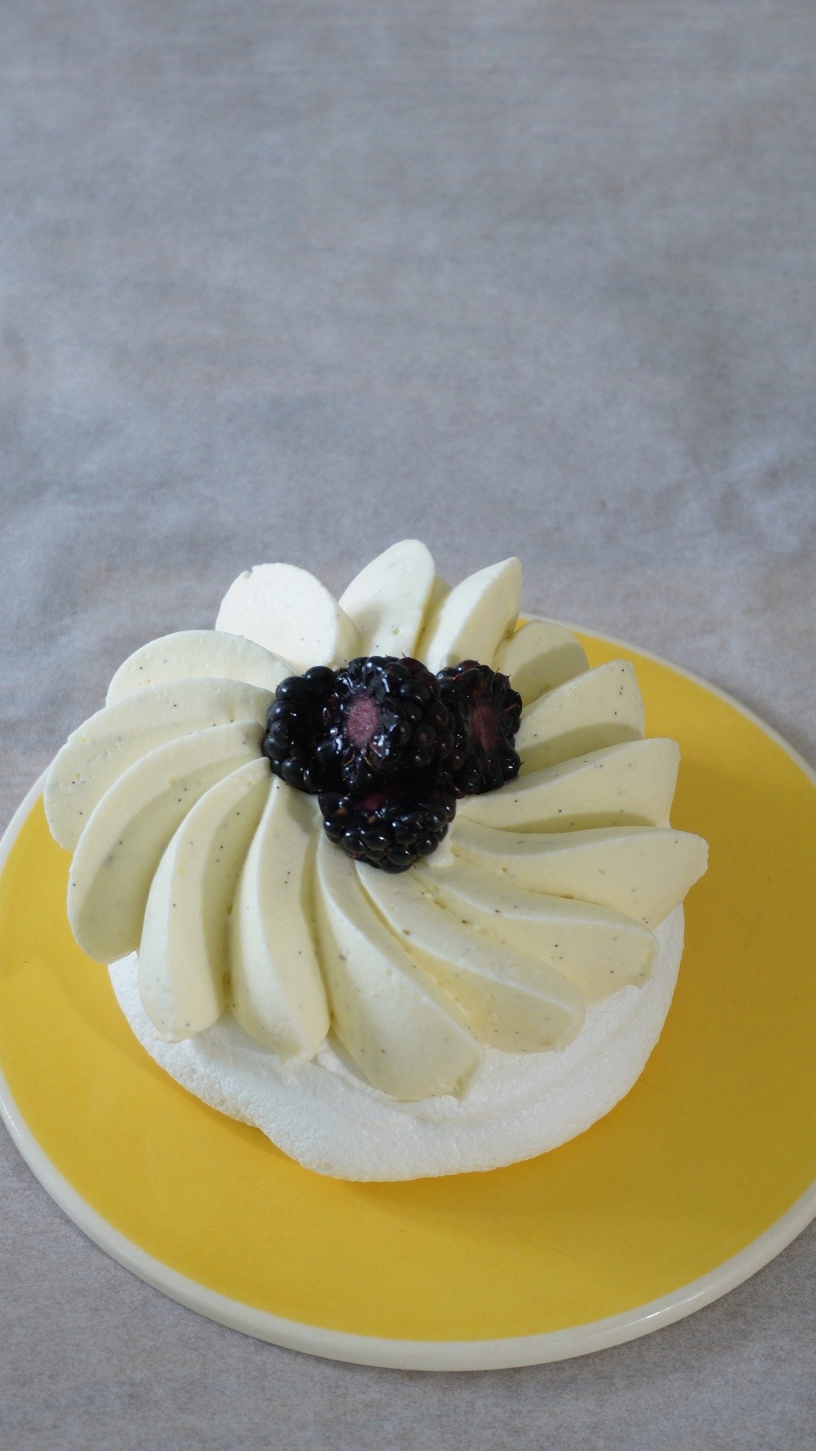 Tag din afkølede marengs, læg en klat marmelade i udhulningen, og sprøjt et flot mønster med mascarponecremen. Alternativt kan du bare lægge en klat ovenpå. Derefter pyntes med friske brombær.